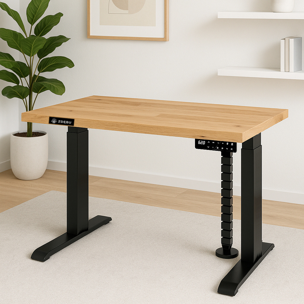Biurko elektryczne marki ZDĘBU, to zestaw stelaż biurka elektryczny + blat z płyty meblowej: