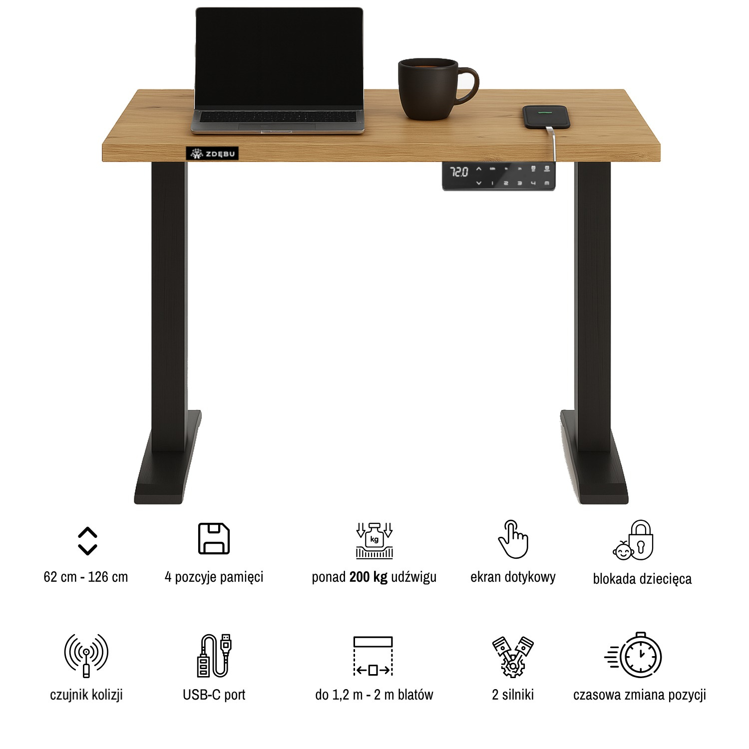 Biurko elektryczne dębowe 120x80x3 | 200 kg | 100% Dąb naturalny